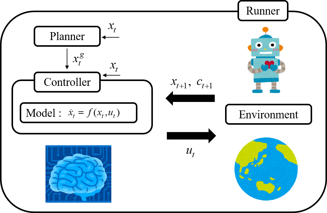 When we design control systems, we should have Model, Planner, Controller and Runner as shown in the figure. It should be noted that Model and Environment are different. As mentioned before, we the algorithms for linear model could be applied to nonlinear enviroments if you have linealized model of nonlinear environments. In addition, you can use Neural Network or any non-linear functions to the model, although this library can not deal with it now.